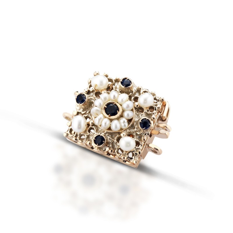 Chiusura in oro rosa, zaffiri naturali e microperle infilate a mano con filo d'oro.