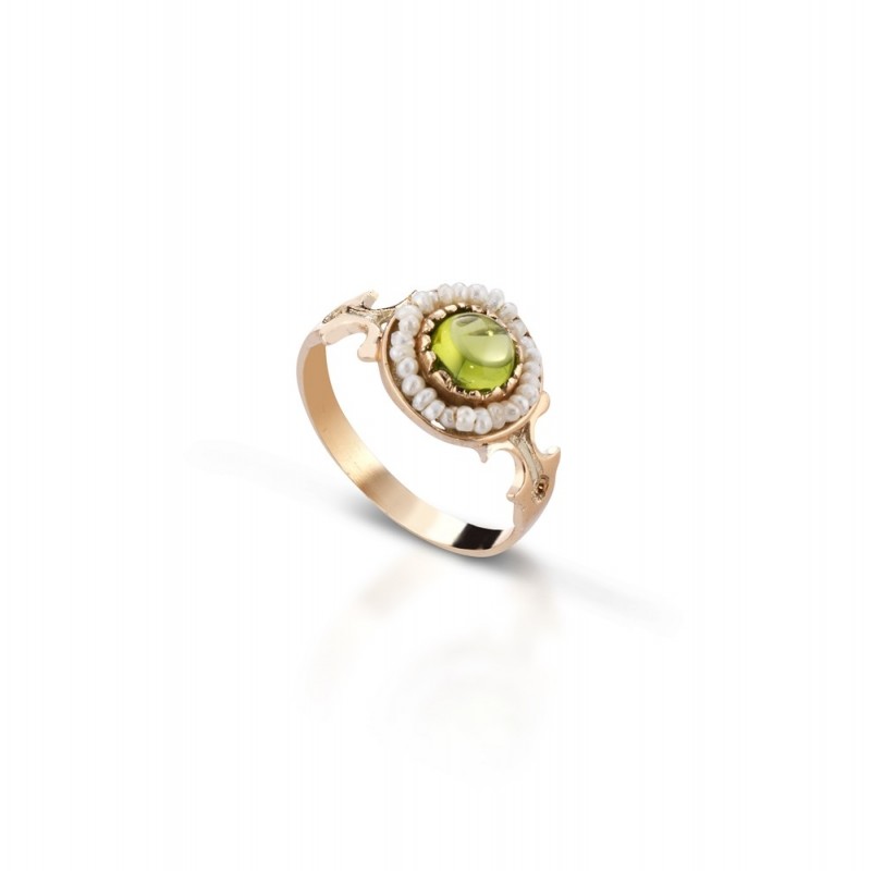 Anello in oro rosa 9kt, con cabochon di peridoto e microperle infilate a mano con filo d'oro.