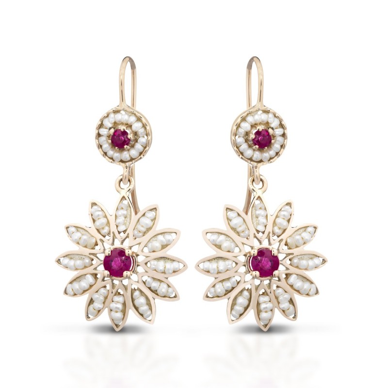 Orecchini in oro rosa 9kt, con rubini naturali 0.80ct e microperle infilate a mano con filo d'oro.