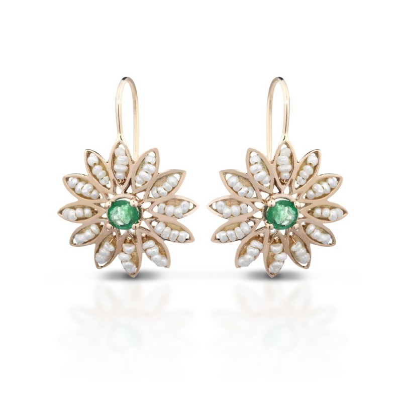 Orecchini in oro rosa, smeraldi naturali e microperle infilate a mano con filo d'oro.