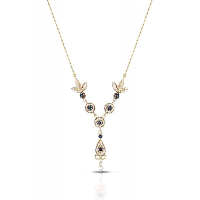 Collana in oro rosa 9kt, con zaffiri naturali 0.74ct e microperle infilate a mano con filo d'oro.