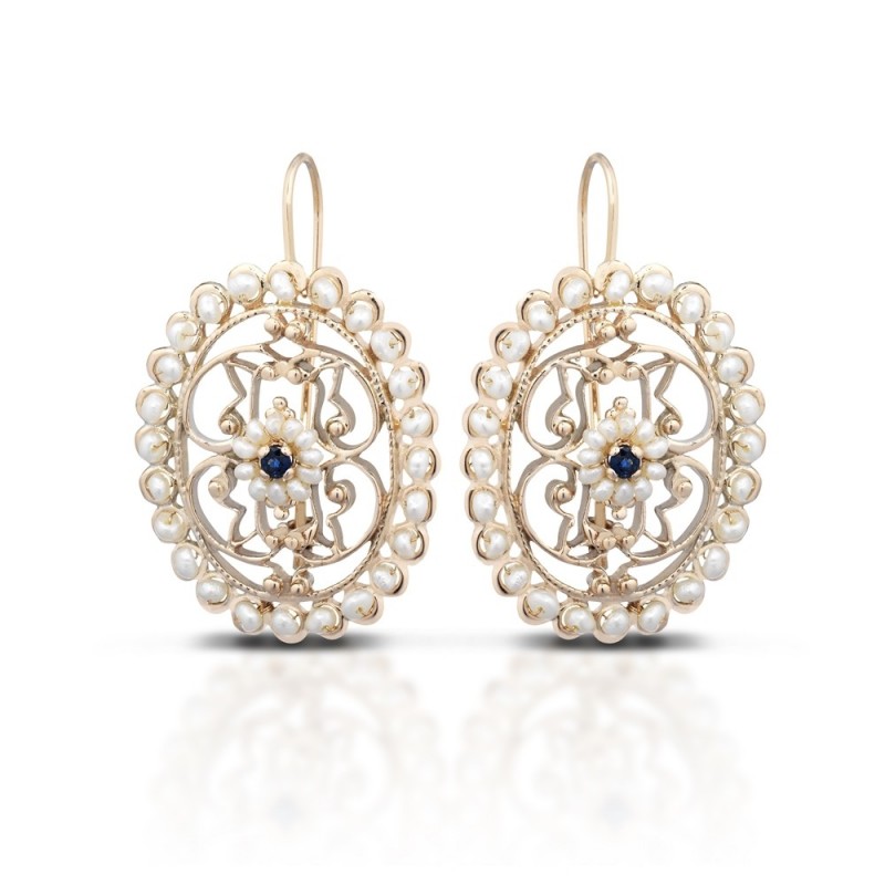 Orecchini in oro rosa 9kt, con zaffiri naturali 0.12ct e microperle infilate a mano con filo d'oro.